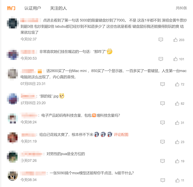 “5000的限量键盘炒到了7000,这连一半都不到,演唱会黄牛票炒到翻3倍,包炒到翻2倍,Labubu都已经炒到不知道多少了,这些也就是看看,键盘鼠标我还能摸得到玩的爽,结果就垃圾了。”